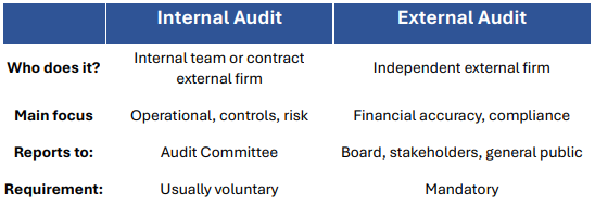 Internal Auditing: Independent checks by auditors after the fact to confirm compliance and effectiveness. (Independent reassurance.)